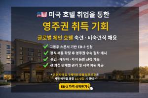 미국 호텔 취업 기반 영주권 (EB-3) 취득 기회! 미국 영주권을 준비하시면서 공장 업종만 알아보고 계신가요? EB-3 취업이민은 반드시 힘든 공장 근무만 있는 것이 아닙니다. 당사는 미국 내 글로벌 체인 호텔과 협력하여 보다 안정적인 환경에서 근무하며 미국 내 글로벌 체인 호텔과 협력하여 보다 안정적인 환경에서 근무하며 합법적으로 영주권을 준비할 ...